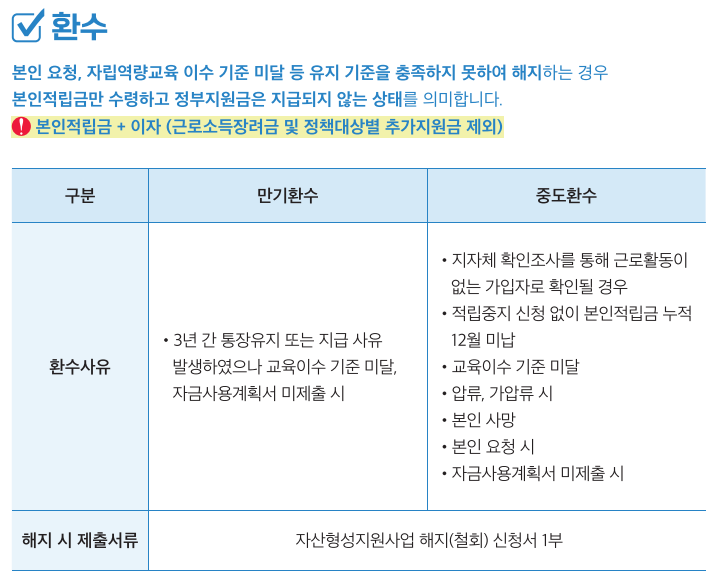 - 중도해지 시 정부 지원금은 지급되지 않으며, 본인이 납입한 금액 + 이자만 반환